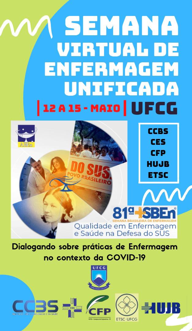 Estamos vivenciando uma pandemia sem precedentes na história da humanidade contemporânea, em decorrência do novo coronavírus (Sars-CoV-2), o que exigiu o distanciamento social como estratégia fundamental na diminuição da curva epidêmica desta doença. Cumprindo o seu papel social as universidades vêm se destacando como centro de formação de novos saberes na busca de soluções para os problemas experienciados na atual conjuntura. Neste sentido, os cursos de Enfermagem do CFP (UAENF, ETSC e HUJB), CES e CCBS, da UFCG, a partir de uma parceria envolvendo diversos atores, elaboram a “Semana Virtual de Enfermagem Unificada da UFCG” entre os dias 12 e 15 de maio com temática “Dialogando sobre as práticas de Enfermagem no contexto da COVID-19. O objetivo desse evento é compartilhar saberes, com base em fundamentos científicos, com vistas a consolidar o protagonismo da enfermagem nas práticas de cuido sensível, integral e ético ao sujeito, família e comunidade frente as adversidade da COVID-19.